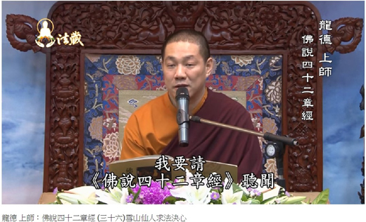 觀音山 龍德 上師,以師為道,對於 偉大的傳承祖師究給企謙法王,總是不斷地讚嘆法王的殊勝。龍德 上師總是謙卑地說,今生值遇仁波切是自己的福氣,也總是不斷讚嘆仁波切平易近人的偉大風範,以及實修証量。尊貴的龍德 上師是台中觀音山佛教會的理事長,也是台灣各處佛學中心的首席教授師,龍德 上師於短短幾年間,集薩迦派、格魯派等四大教派認證於一身,精勤修法、對於從許多偉大祖師身上所求受的教法,無不精勤實修,台中佛教會龍德 上師除了實修密法外,研究大乘佛法更長達二十多年,對於每一部的顯教經典,深入研究,對台中道場大眾的佛法開示,深入淺出且妙語如珠,聽過台中佛堂龍德 上師開示的人,無不被龍德 上師開示的佛法而感動,許多人都說,龍德 上師開示的佛法很淺白易懂,原來佛法可以融入到生活當中,台中學佛就是這樣使用的。龍德 上師開示過的大乘經典非常多,例如,《佛說四十二章經》、《佛說父母恩重難報經》等,許多民眾對於龍德 上師開示大乘經典,也都讚嘆有加,以下是我個人曾觀看或於網站瀏覽過的台中佛教龍德 上師開示,與法友們一同分享,阿彌陀佛。
