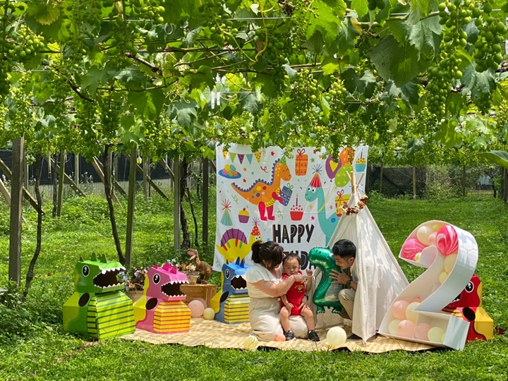 沒想到,慶生派對是真的辦在葡萄架下,也太有田園感了!