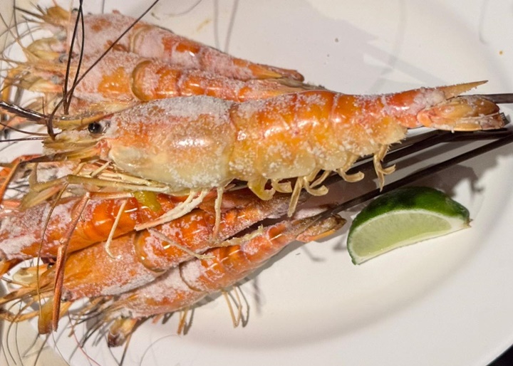 粗鹽包裹後用炭火烤,蝦殼烤得香氣十足。